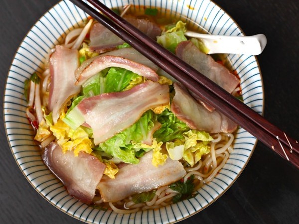 Sự kết hợp tuyệt vời giữa rau và thịt. Cho 2 lát thịt hun khói cắt thành từng miếng vừa ăn và một vài lá bắp cải thái nhỏ vào nồi khoảng 2 phút trước khi Mì chín. Chắc chắn những lát thịt hun khói sẽ bị "xơi tái" đầu tiên, nhưng đừng lo - chúng vẫn để lại cho bát Mì mùi vị béo ngậy tới từng giọt nước dùng cuối cùng.