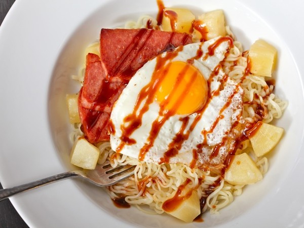 Mì trần qua nước sôi, để ráo nước rồi cho ra đĩa. Thịt hộp rán cháy cạnh, thêm vài khoanh dứa (có thể tươi hoặc đóng hộp), một quả trứng ốp-lếp và rưới đẫm nước sốt thịt nướng kiểu Nhật.