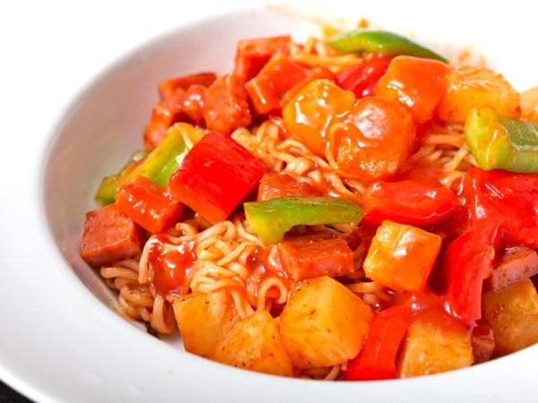 Nấu Mì cho tới khi các sợi bắt đầu rời nhau, vớt ra để ráo. Làm nóng chảo, cho một thìa dầu ăn, bỏ ớt xanh và thịt hộp thái hạt lựu vào đảo chín tới. Thêm vài khoanh dứa hộp với nước sốt, một lượng ketchup tùy ý và tương ớt tỏi. Rưới hỗn hợp này lên Mì và thưởng thức.