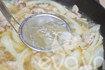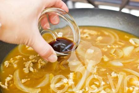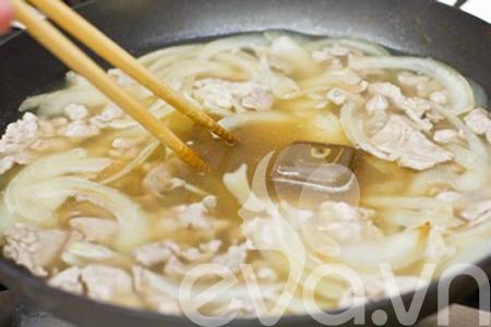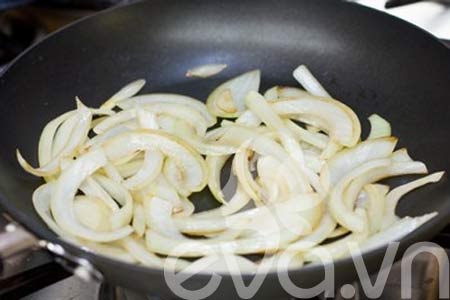 Bước 1: Đun nóng dầu ăn trên chảo, cho hành tây thái lát vào đảo nhanh tay cho thơm vàng.