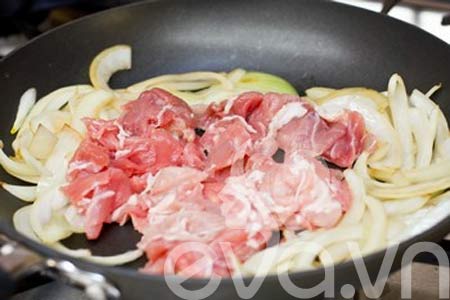 Bước 2: Chọ thịt lợn vào xào cùng, đảo đều tay cho đến khi thịt không còn màu đỏ.